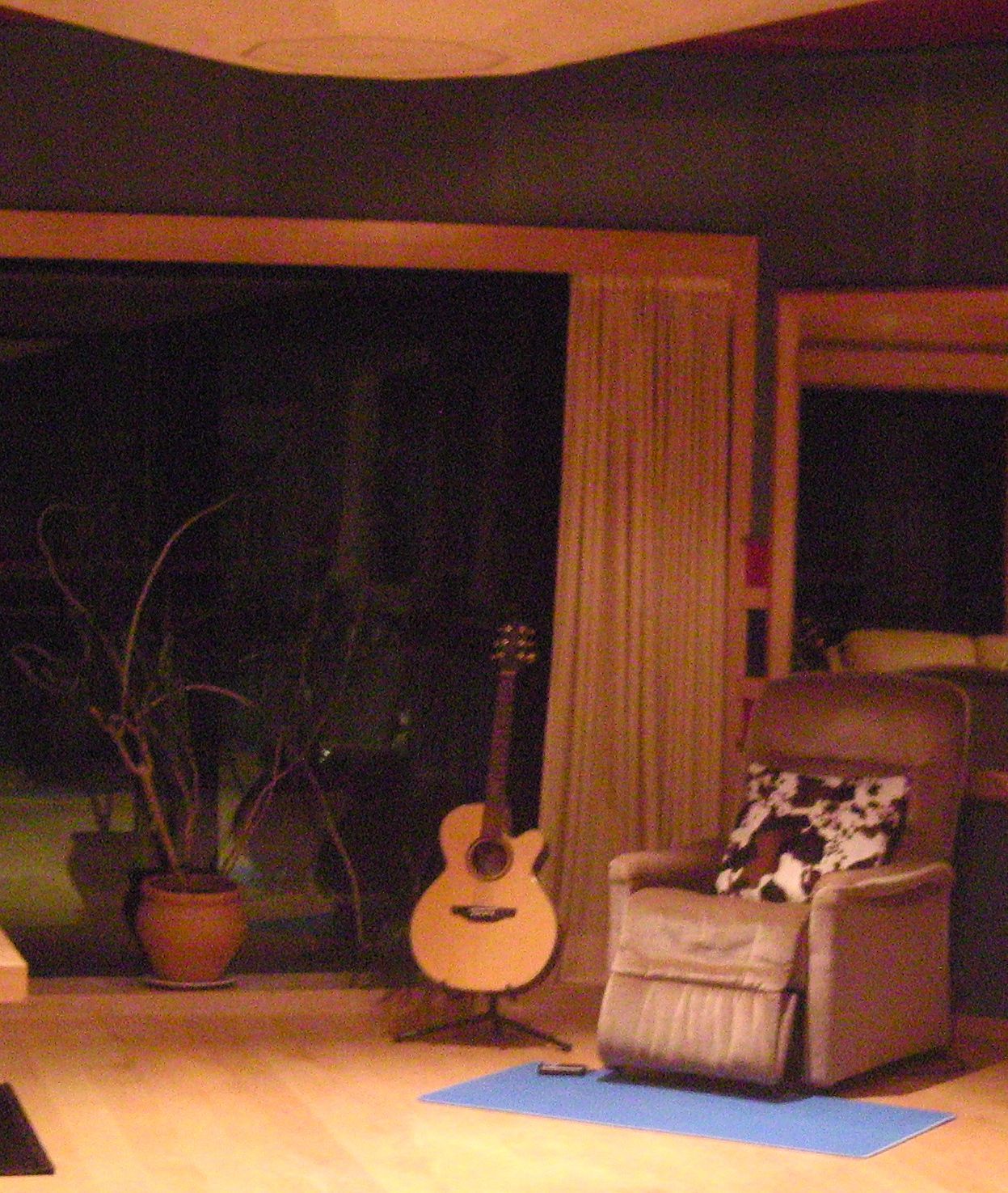 The acoustic guitar I recorded with can be seen in the picture below. Its an old beat up thing that I cant remember the name of now. The live room is the room I recorded in, you can see the Microphone I used for the vocals too, very nice indeed.