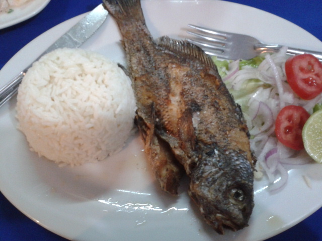 That evening we went to the local store, 1 of 2 in the whole place, to get some bits and pieces. We got some ham, bread, eggs and beer, the essentials. There were no prices on anything of course and when we went up to pay, the guy behind the counter began adding everything up. “Eggs, Ehm… 3 Soles, Ham Ehm… 5 Soles” randomly plucking prices out of the air. We just stood and laughed because it was so obvious. To be fair it was still dirt cheap but there is definately one price for the tourists and another for the locals. The main mode of transport in Paracas seems to be these little Tuk-Tuk type 3 wheeled cars. They cover them in stickers of Batman, X-men and anything else to make them look souped up. Spoilers and all. They look so funny. All day and most of the night they drive around beeping their horns at tourists to see if they need a taxi. Its ridiculous because there is only one road in Paracas so they just drive up and down the same road all day long. Paracas is pretty isolated so there are no ATM machines here. Susan and I ran out of money, so on the last night, with nowhere to get money, we needed to get dinner and had to find a very cheap restaurant. We found a small dodgy lookig place that had a day menu for 15 Soles, it consisted of a starter which was Ceviche, a peruvian fish dish which essentially is just raw fish marinated in lemon juice. For the main menu I chose sea food with rice and some sauce, Susan chose the grilled fish with rice. The sea food dish I chose came out with massive prawns and other weird sea food things most of which were raw. I didnt eat much of it. Susans fish came out with its head and tail still attached, even the eyes were still in it! It looked delicious. We were to feel the effects of this meal for a few weeks to come.