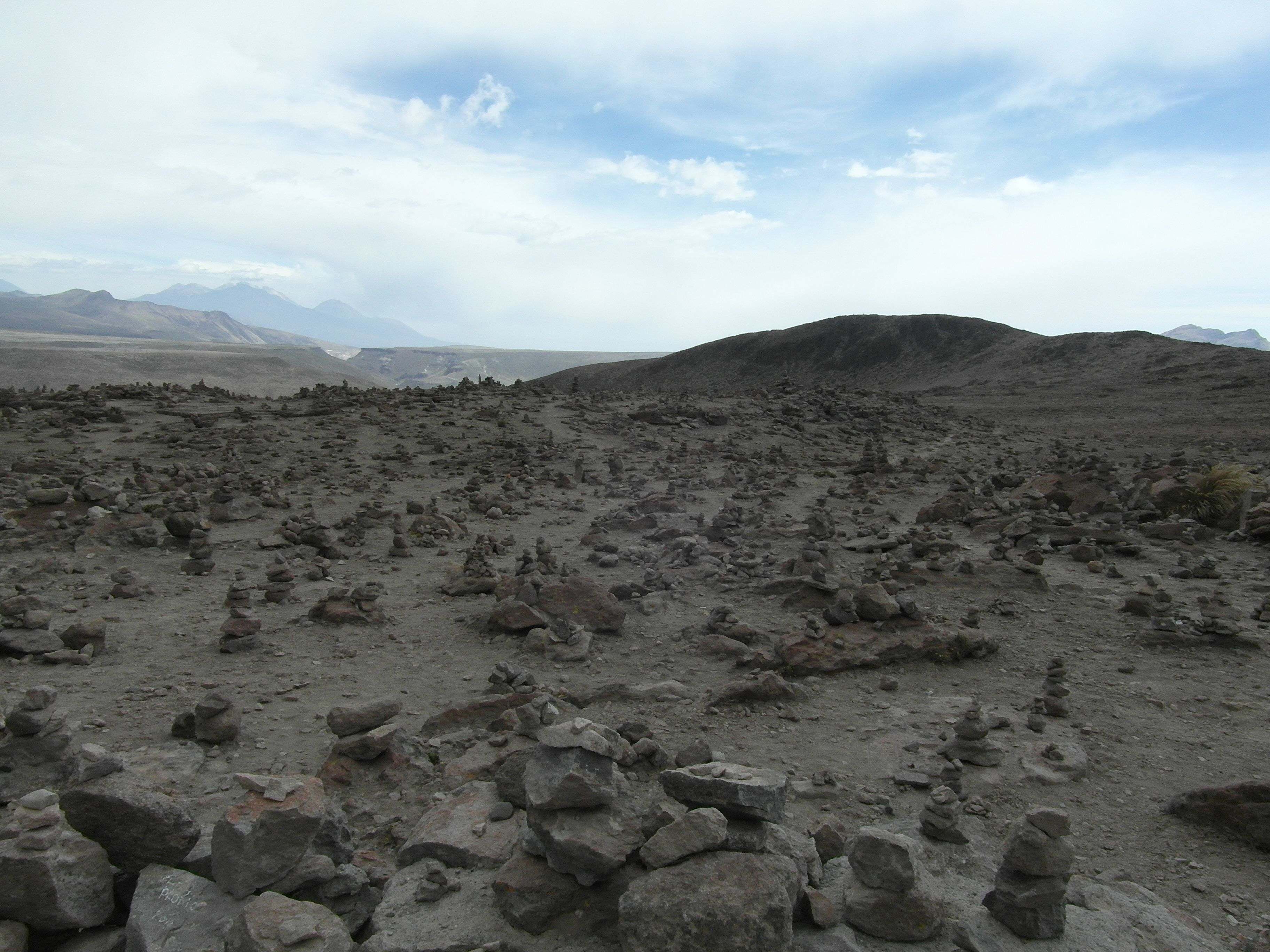 After the village we stopped at a restaurant recommended by the tour and Susan and I went to the shop and got sandwiches for 1 euro or something. On the way back to Arequipa we drove across the highest mountain in the region, at 5,200 metres. I felt very lightheaded when we stopped there and could not have stayed there too long. Our guide showed us that the local people there hike to this point and place stones on top of each other, largest to smallest and wish for things. Simple things like a car, money, or even health. Piles of these stones can be seen all over Peru and Bolivia.